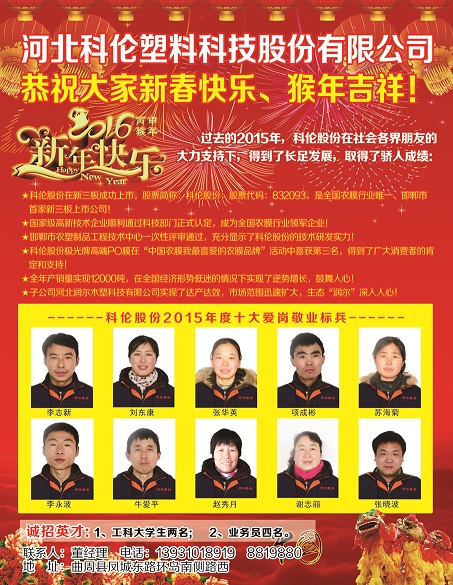 點擊數(shù):72572016-01-28 08:30:38 來源: 科倫塑業(yè)集團(tuán)股份有限公司|農(nóng)用薄膜|po膜|轉(zhuǎn)光膜|EVA消霧膜|高效日光膜|棚膜|地膜|包裝膜|土工膜|
