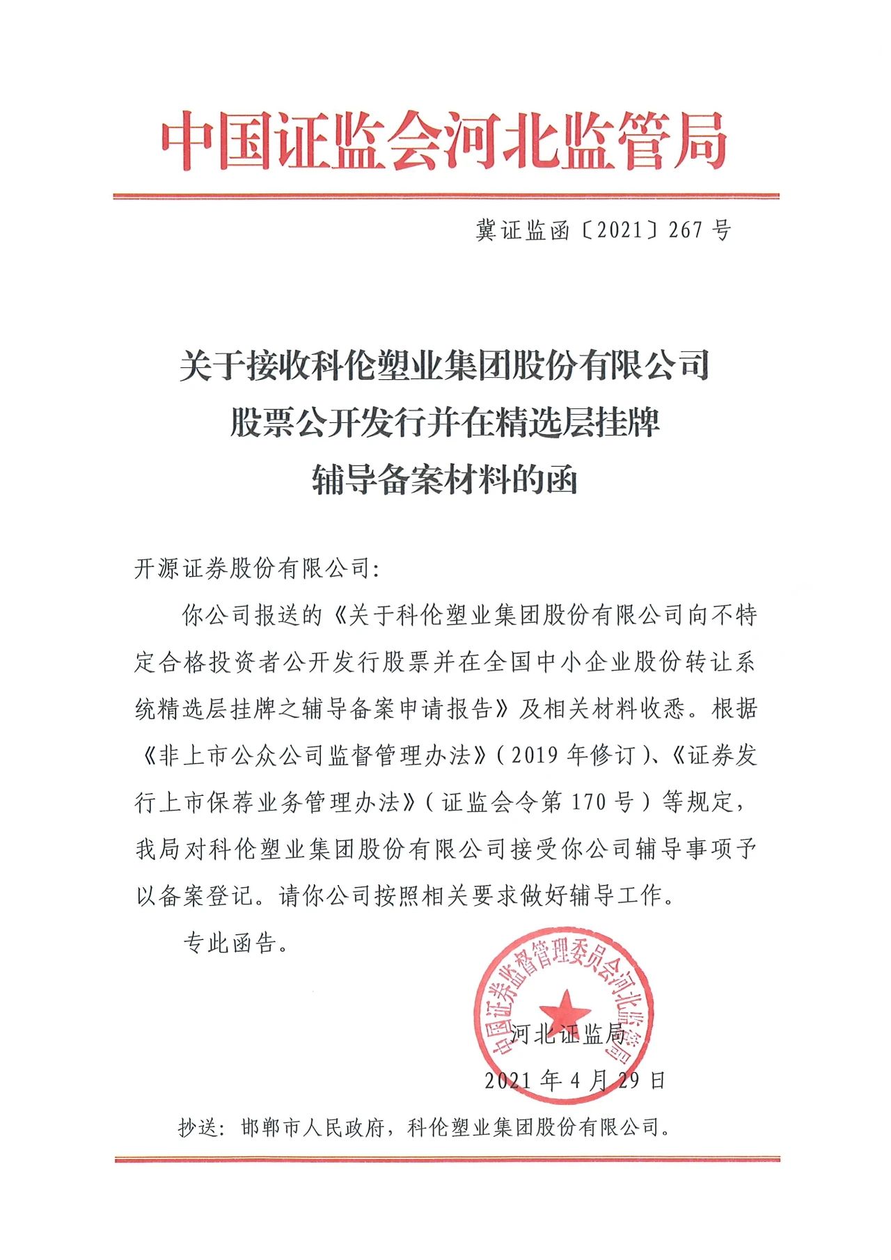 中國證監(jiān)會河北監(jiān)管局批準(zhǔn)開源證券對科倫塑業(yè)集團(tuán)進(jìn)行上市輔導(dǎo)