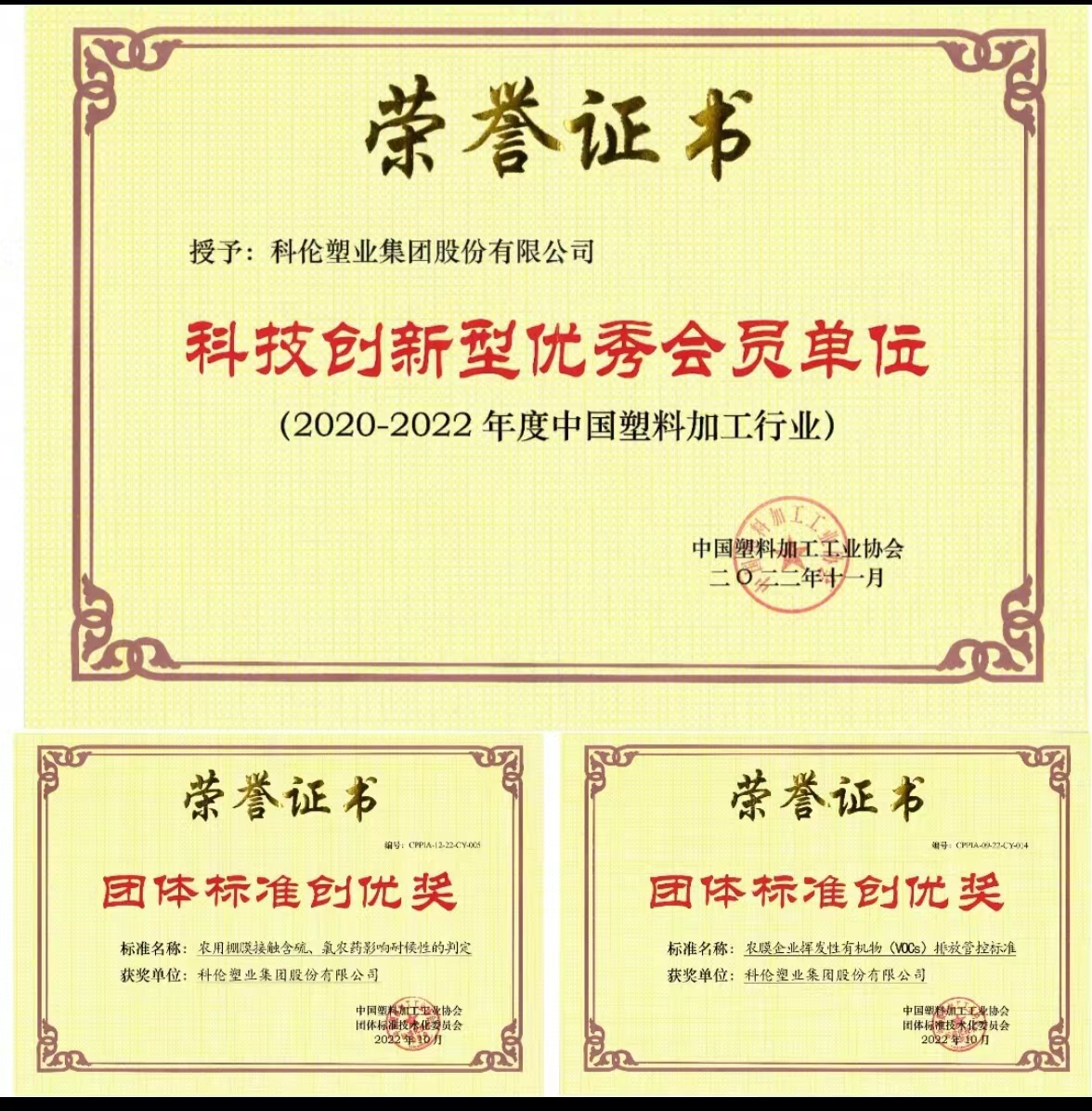 展會(huì)期間,公司有關(guān)人員先后參加了中國(guó)塑協(xié)專家委員會(huì)換屆大會(huì)暨塑料新材料新技術(shù)新成果交流會(huì)、中國(guó)塑協(xié)團(tuán)體標(biāo)準(zhǔn)化技術(shù)委員會(huì)2022年年會(huì)和《農(nóng)業(yè)用功能性聚烯烴涂覆棚膜》團(tuán)體標(biāo)準(zhǔn)技術(shù)研討會(huì)。取得了可喜成績(jī),獲得三項(xiàng)殊榮。分別是2020-2022年度科技創(chuàng)新型優(yōu)秀會(huì)員單位、團(tuán)體標(biāo)準(zhǔn)創(chuàng)優(yōu)獎(jiǎng)兩項(xiàng)。