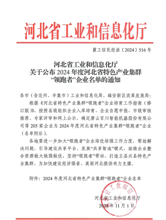 近日,省工信廳公布了2024年度河北省特色產(chǎn)業(yè)集群“領(lǐng)跑者”企業(yè)名單,我公司名列其間。
